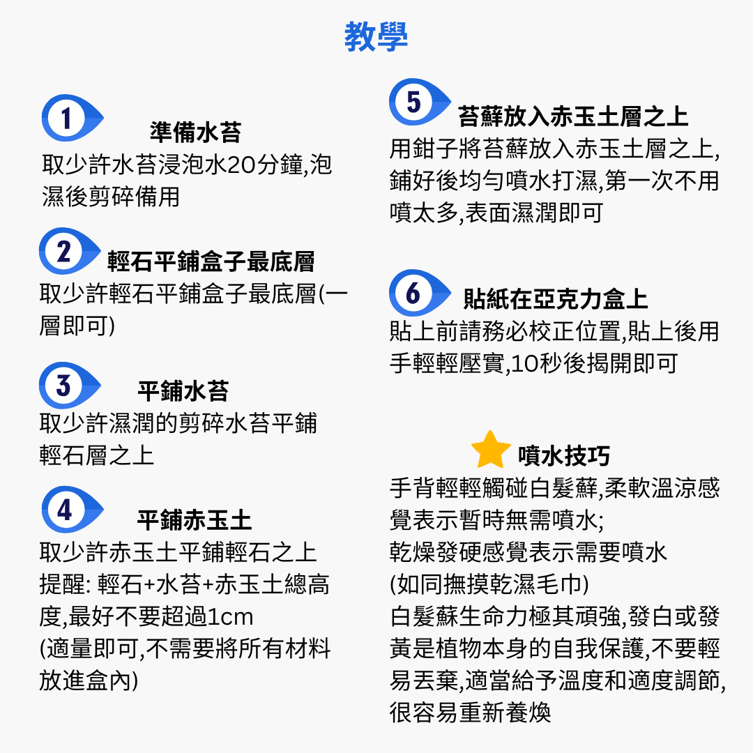 Material package: Material package: 10cmx10cm transparent square box, small stones, vermiculite, soil, moss, small figurine decoration, watering can, pliers, spoon, cleaning cloth, dripping pipe