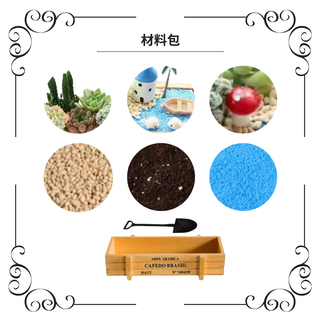 Material package: background plants, planting soil, pumice, small figurines, small shovel, sand