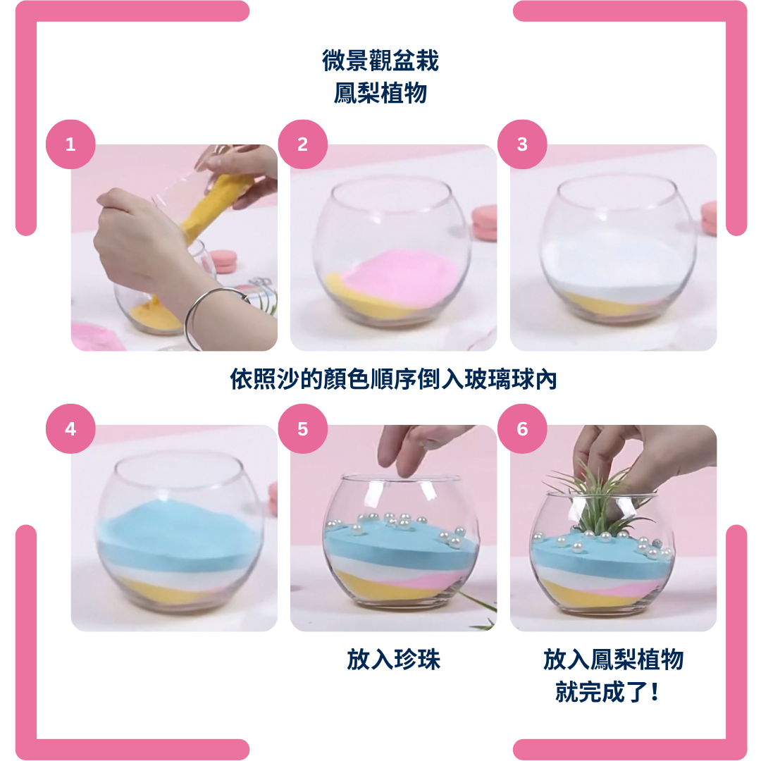 Tool kit: glass balls, bromeliad plants, imitation pearls, sand (blue, pink, green, white)