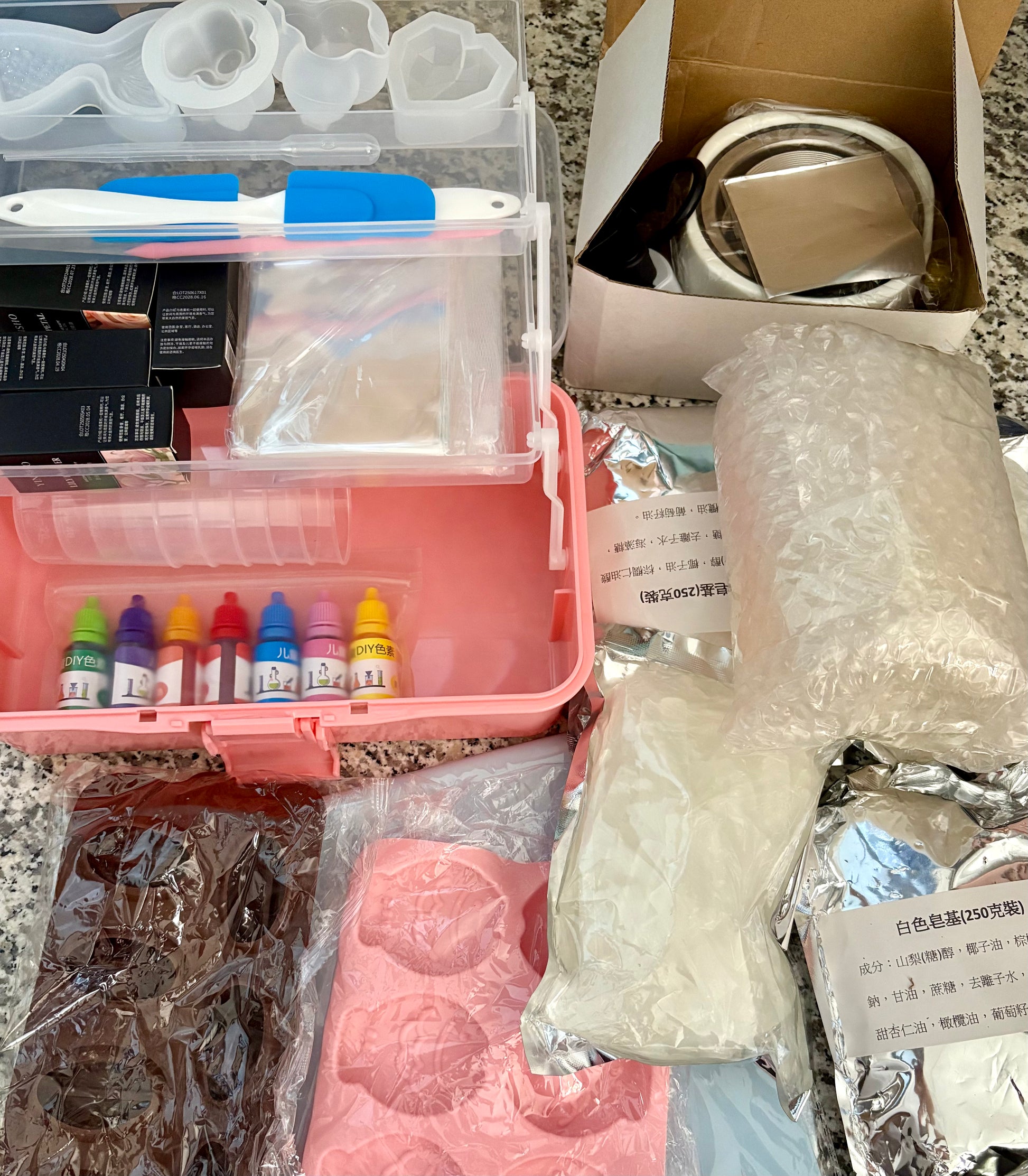 Material package: white soap base 500g, transparent soap base 500g, molds x4, sea bream mold x1, animal mold x1, pigments x4, essential oils x7, electric stove x1, beaker x1, silicone scraper x2, silicone stirring stick x1, dropper x1, foaming net x4, small plastic bag x100, measuring cup x6