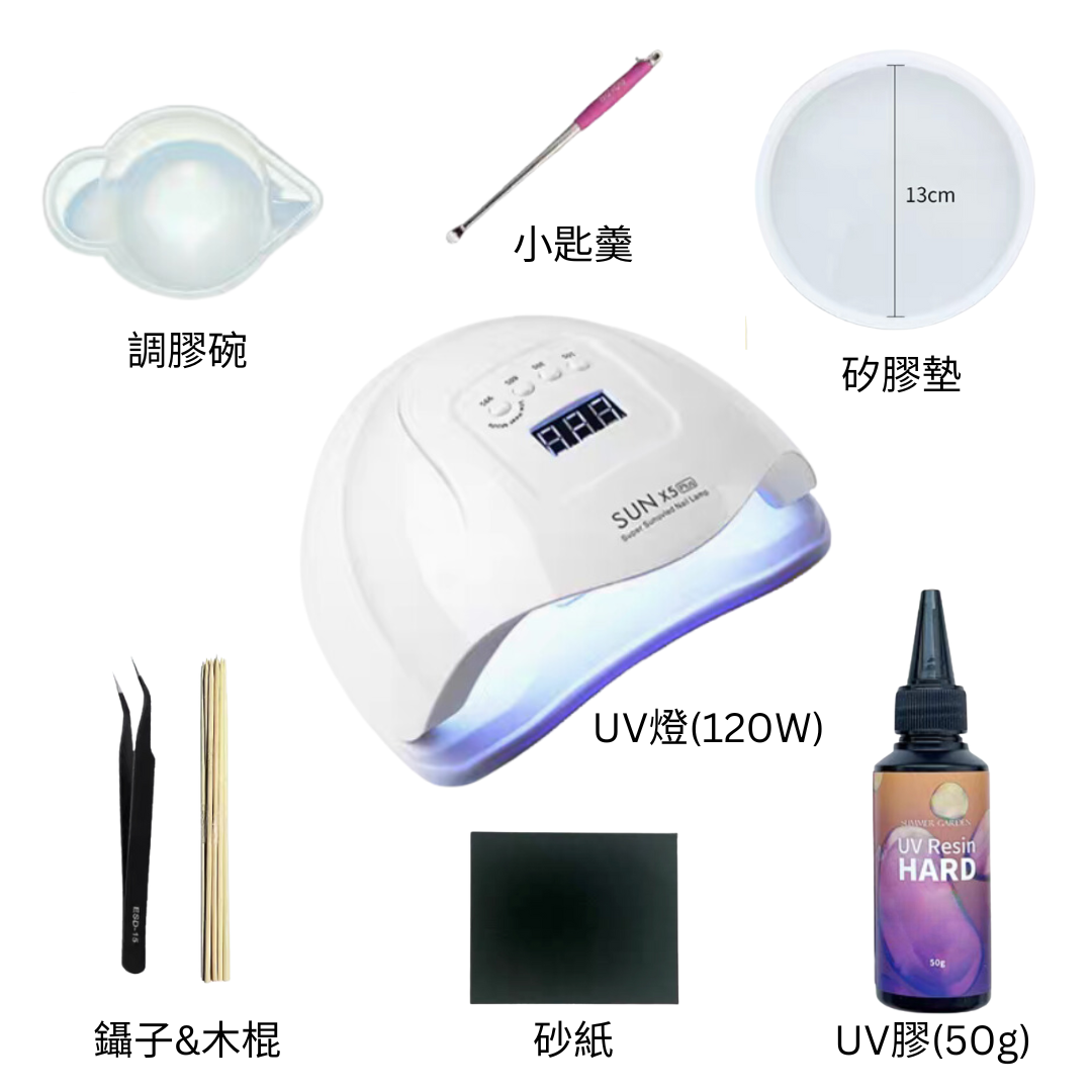Tool kit: keychain mold (*The finished product is about 6mm in height), 1 gold-stamped letter sticker, 2 boxed flowers (please contact customer service for the color you want when placing an order, otherwise it will be shipped randomly), 5 keychain metal accessories