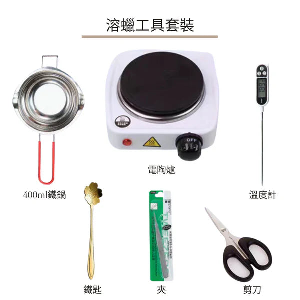 Toolkit: Sand wax, wax core (1 stick), Stirring stick (1 stick), Glass, Fragrance, Cactus candle, Small cards