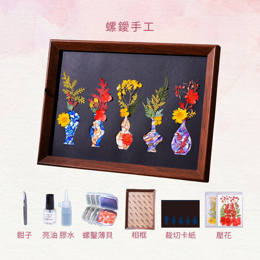 Toolkit: drawing tool kit, pigment, Color palette, shell, Quartz powder, Small wooden frame, Artboard