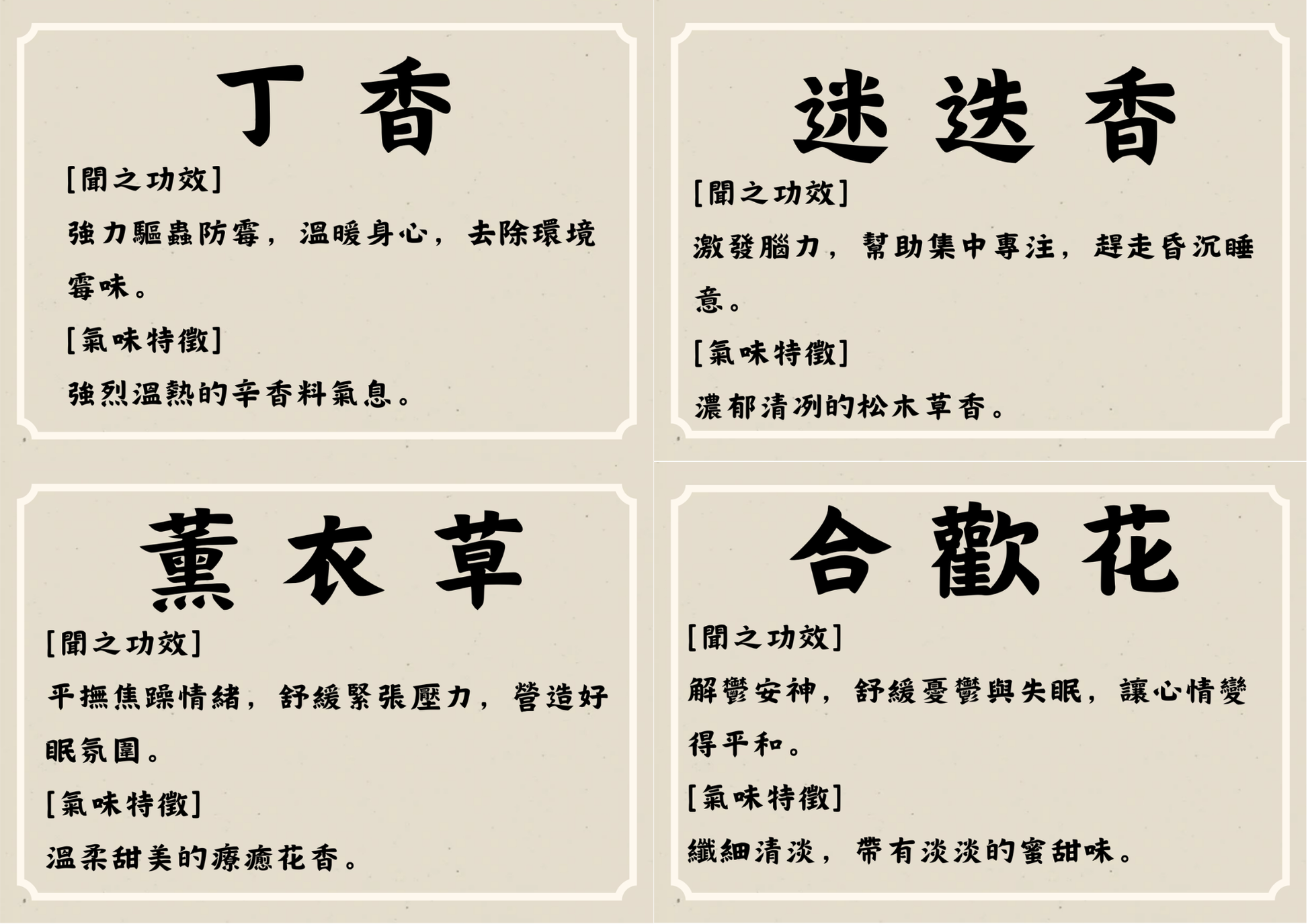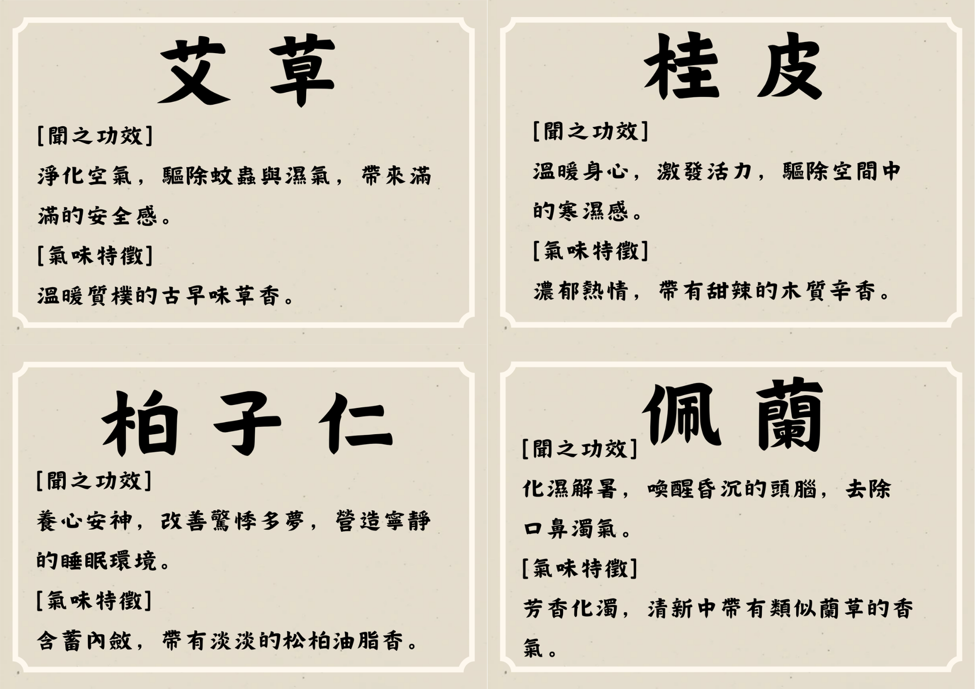 佩蘭:香味清爽,可「芳香化濁」,減少空氣中悶濁感,讓人感覺環境更清新、頭腦較不昏沉,幫助調整到適合休息的狀態。