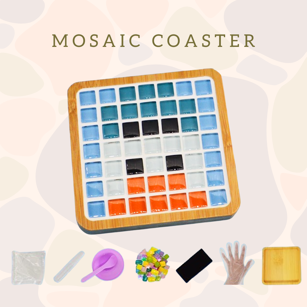 材料包:圖紙, 杯墊, 馬賽克, 膠水, 填縫劑, 手套, 海綿, 碗及攪拌匙