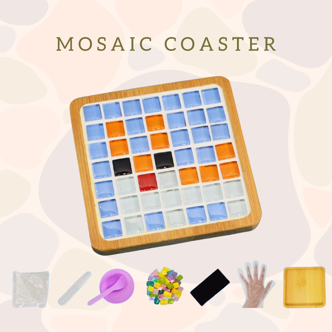 材料包:圖紙, 杯墊, 馬賽克, 膠水, 填縫劑, 手套, 海綿, 碗及攪拌匙