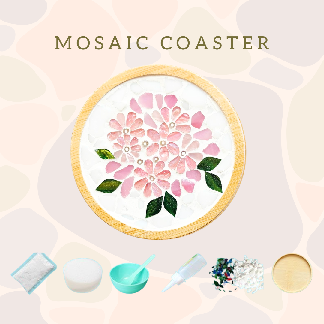 材料包:圖紙, 杯墊, 馬賽克, 膠水, 填縫劑, 手套, 海綿, 碗及攪拌匙